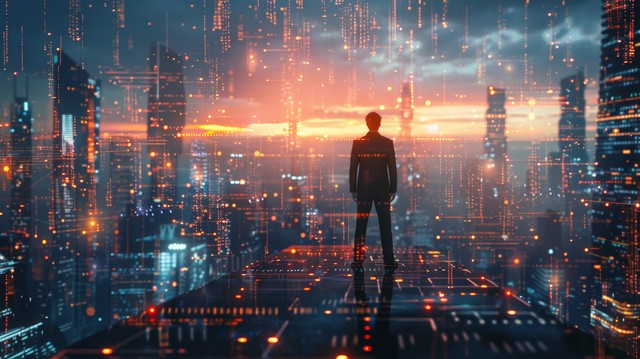商人站在充满未来网络技术的城市环境中,周围是高科技建筑和数字信息流,
