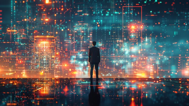 商人站在充满未来网络技术的城市环境中,周围是高科技建筑和数字信息流,