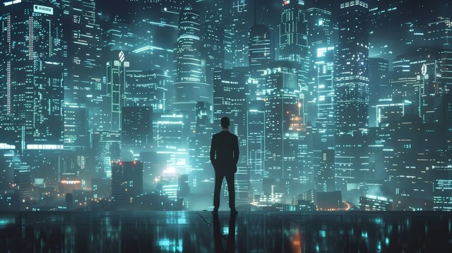 商人站在充满未来网络技术的城市环境中,周围是高科技建筑和数字信息流,