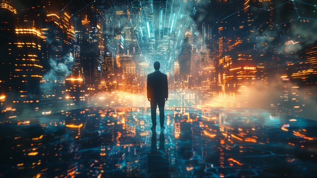 商人站在充满未来网络技术的城市环境中,周围是高科技建筑和数字信息流,