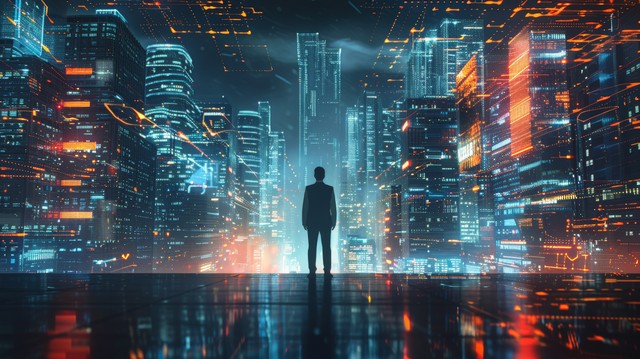 商人站在充满未来网络技术的城市环境中,周围是高科技建筑和数字信息流,