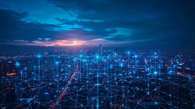 网络节点,现代创意的网络节点在智慧城市中互联,在5G和无线技术的先进数字连接中