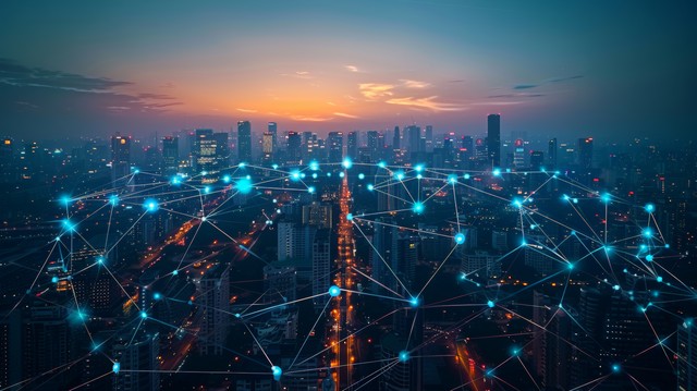 网络节点,现代创意的网络节点在智慧城市中互联,在5G和无线技术的先进数字连接中