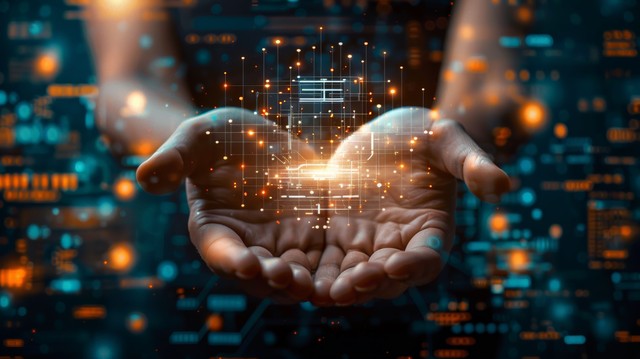 手握着代表数字技术的元素,在充满数字化符号和界面的抽象背景中,