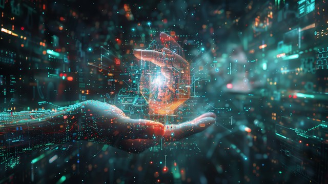 手握着代表数字技术的元素,在充满数字化符号和界面的抽象背景中,
