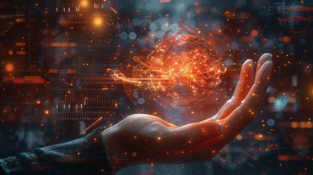 手握着代表数字技术的元素,在充满数字化符号和界面的抽象背景中,
