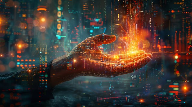 手握着代表数字技术的元素,在充满数字化符号和界面的抽象背景中,