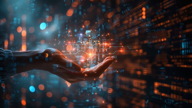 手握着代表数字技术的元素,在充满数字化符号和界面的抽象背景中,