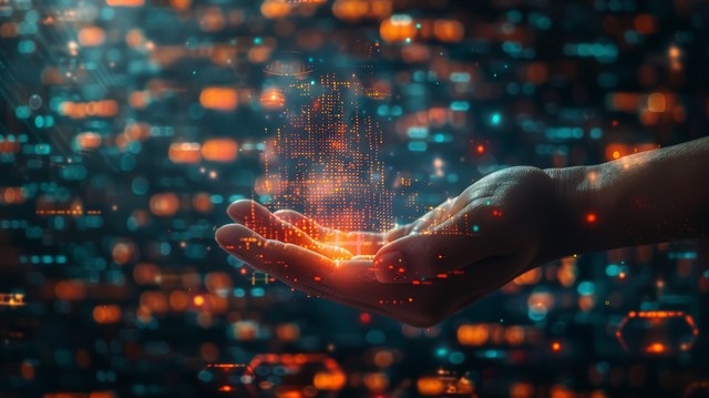 手握着代表数字技术的元素,在充满数字化符号和界面的抽象背景中,