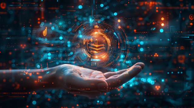 手握着代表数字技术的元素,在充满数字化符号和界面的抽象背景中,