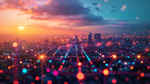 网络节点,现代创意的网络节点在智慧城市中互联,在5G和无线技术的先进数字连接中