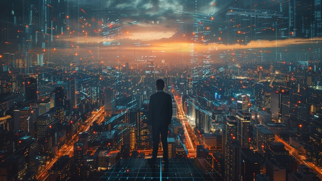 商人站在充满未来网络技术的城市环境中,周围是高科技建筑和数字信息流,