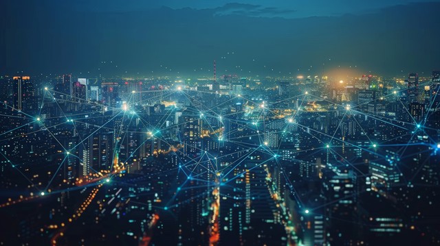 网络节点,现代创意的网络节点在智慧城市中互联,在5G和无线技术的先进数字连接中