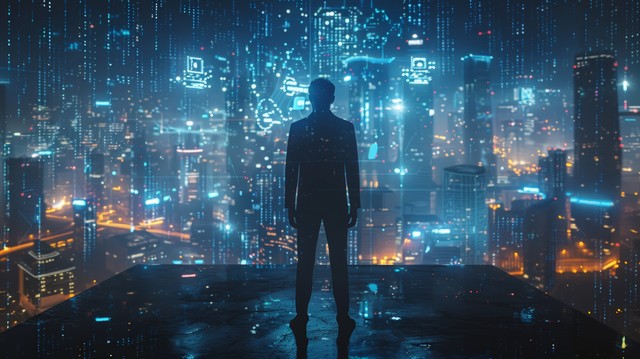 商人站在充满未来网络技术的城市环境中,周围是高科技建筑和数字信息流,