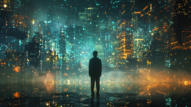 商人站在充满未来网络技术的城市环境中,周围是高科技建筑和数字信息流,