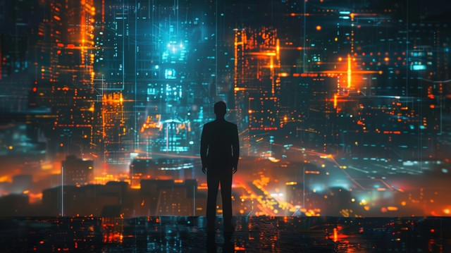 商人站在充满未来网络技术的城市环境中,周围是高科技建筑和数字信息流,