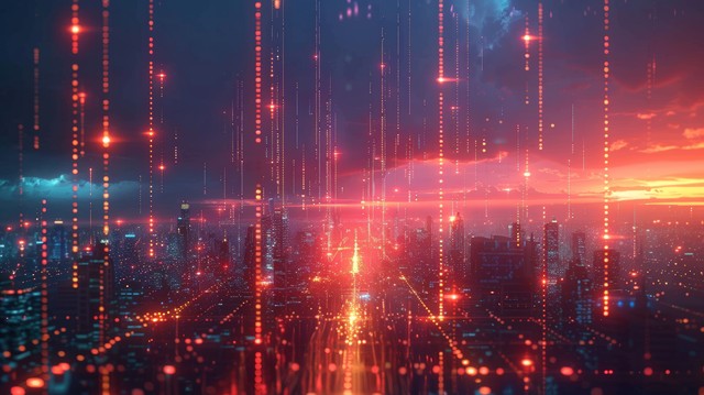 网络节点,现代创意的网络节点在智慧城市中互联,在5G和无线技术的先进数字连接中