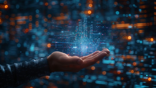 手握着代表数字技术的元素,在充满数字化符号和界面的抽象背景中,