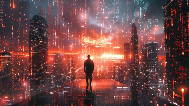 商人站在充满未来网络技术的城市环境中,周围是高科技建筑和数字信息流,