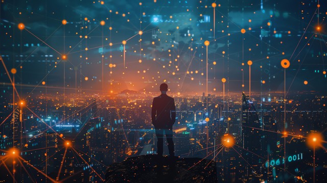 商人站在充满未来网络技术的城市环境中,周围是高科技建筑和数字信息流,