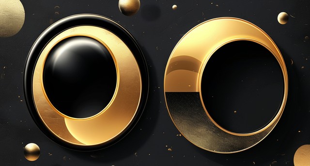 带有两个圆圈的抽象黑色和金色背景。适用于横幅、封面、海报、网站、演示文稿、小册子、传单、标题