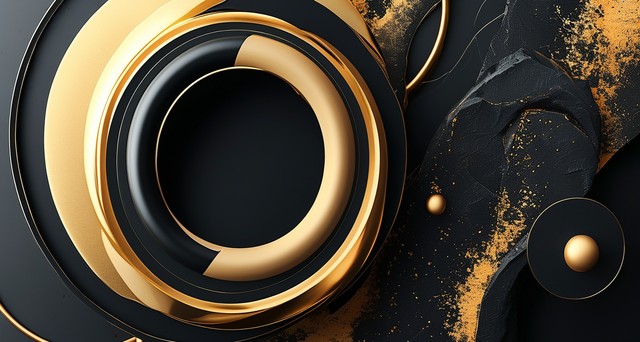 带有两个圆圈的抽象黑色和金色背景。适用于横幅、封面、海报、网站、演示文稿、小册子、传单、标题