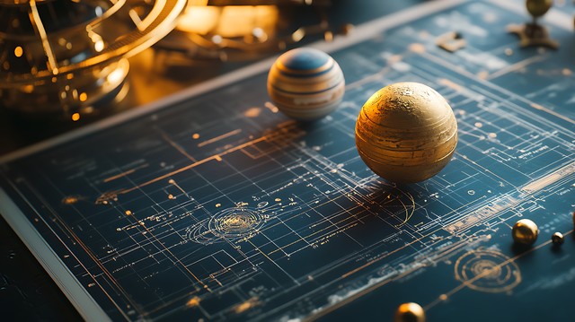 太阳系的各个行星在图纸上排列,代表探讨宇宙的科学探索。