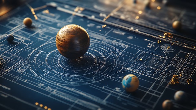 太阳系的各个行星在图纸上排列,代表探讨宇宙的科学探索。