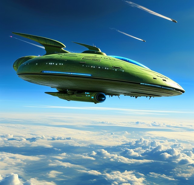 绿色外星飞船在蓝色窗户的天空中飞行