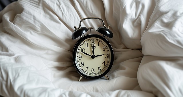一个闹钟静静地放在一张整洁的床上,显示着老太太睡觉的时间。床罩是纯白色的,强调了时钟简单而重要的本质