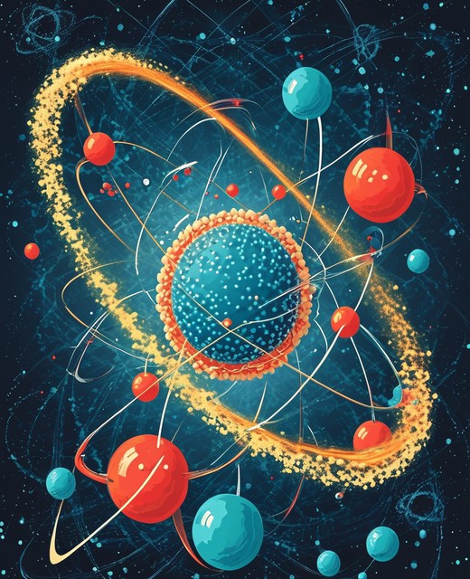 原子结构的原子科学海报:质子和中子的核,轨道电子。矢量插图。核能、科学研究和分子化学的象征。