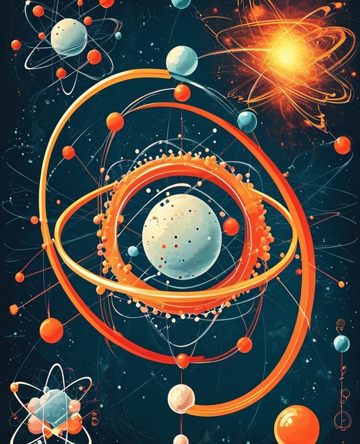 原子结构的原子科学海报:质子和中子的核,轨道电子。矢量插图。核能、科学研究和分子化学的象征。
