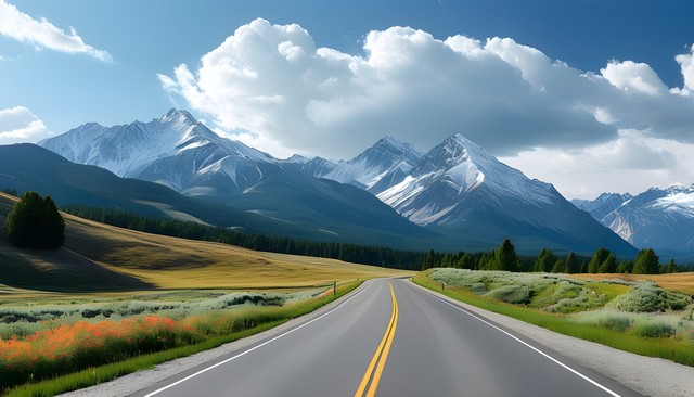 美丽的道路通向巍峨的山脉,云彩在天空中飘荡,展现自然的壮丽景色。