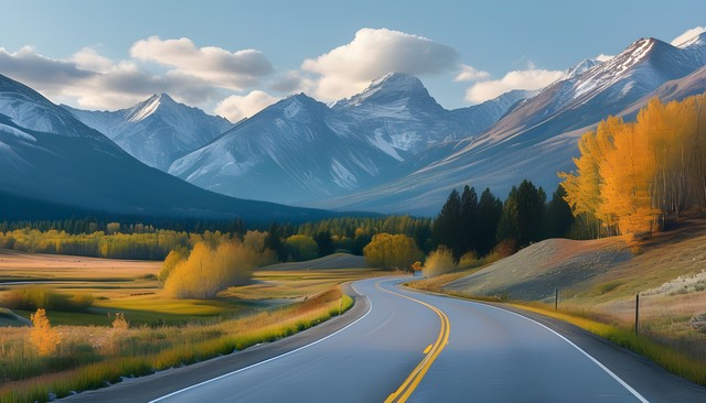 美丽的道路通向巍峨的山脉,云彩在天空中飘荡,展现自然的壮丽景色。