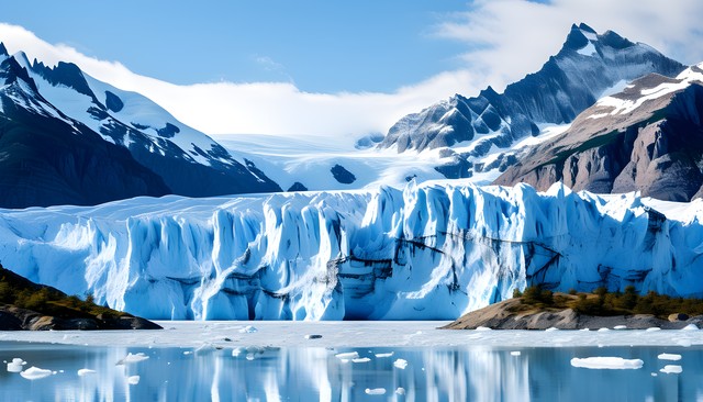 壮丽的冰川坐落在巍峨的山脉之间,湖面映射出冰川的蓝色与周围的自然景观。