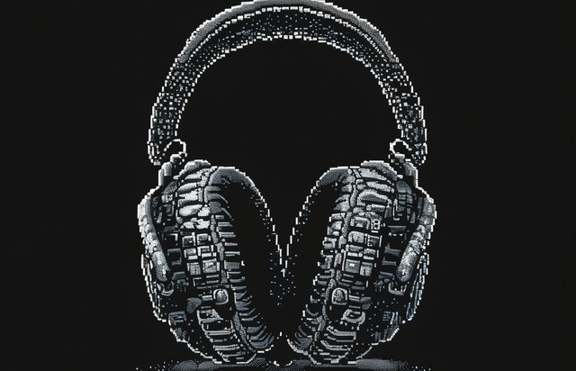 点状像素黑色耳机图标。由圆形物品组成的逼真耳机符号的矢量半色调拼贴画。
