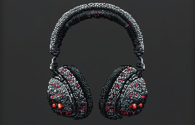 点状像素黑色耳机图标。由圆形物品组成的逼真耳机符号的矢量半色调拼贴画。