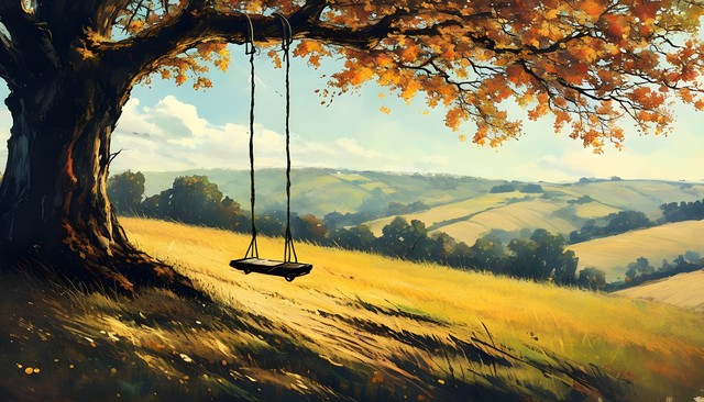 秋天的树木和秋千,温暖的阳光洒在金色的草地上,美丽的自然景色。