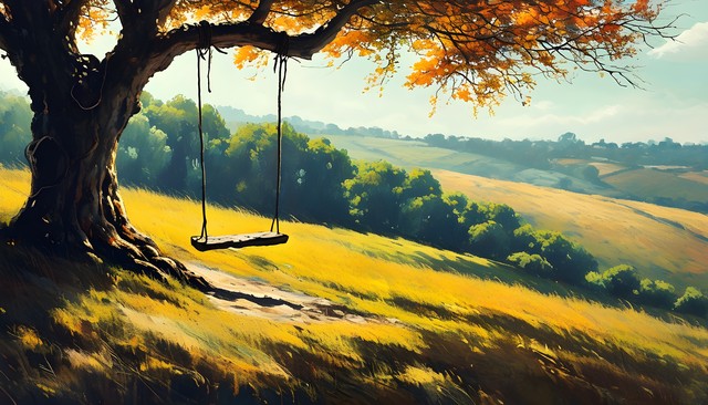 秋天的树木和秋千,温暖的阳光洒在金色的草地上,美丽的自然景色。