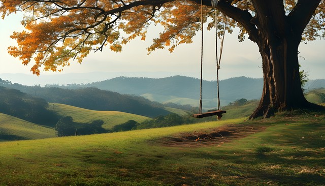 秋天的树木和秋千,温暖的阳光洒在金色的草地上,美丽的自然景色。