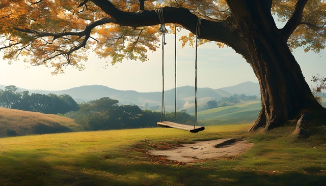 秋天的树木和秋千,温暖的阳光洒在金色的草地上,美丽的自然景色。
