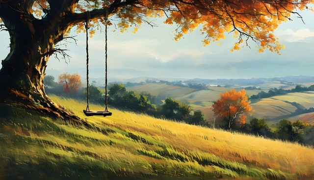 秋天的树木和秋千,温暖的阳光洒在金色的草地上,美丽的自然景色。