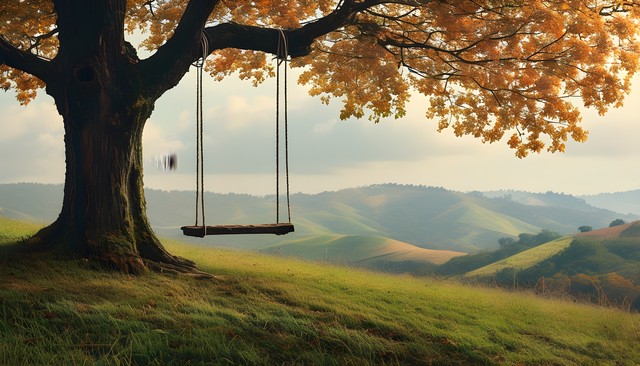秋天的树木和秋千,温暖的阳光洒在金色的草地上,美丽的自然景色。