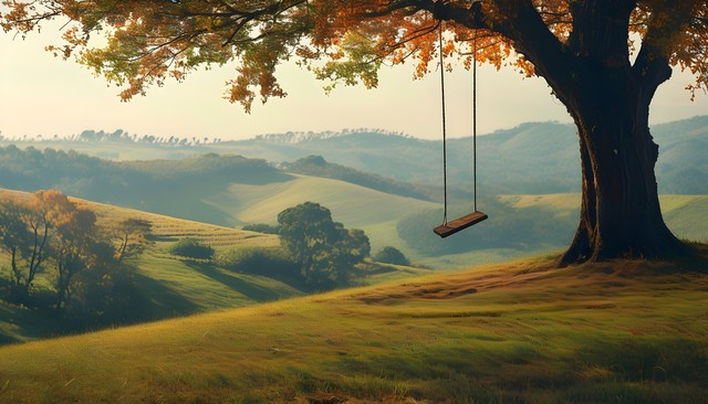 秋天的树木和秋千,温暖的阳光洒在金色的草地上,美丽的自然景色。