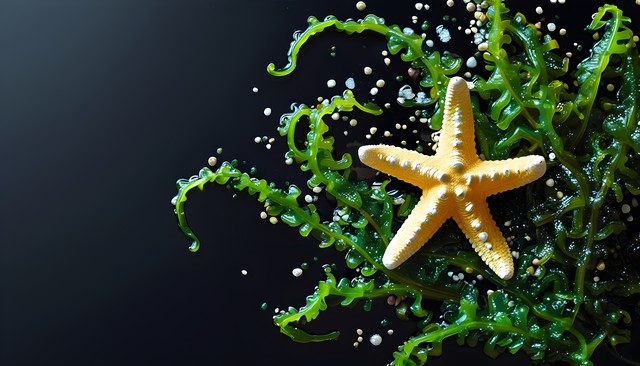 清新的海藻与贝壳在黑色背景上的组合,展现自然与海洋的元素。