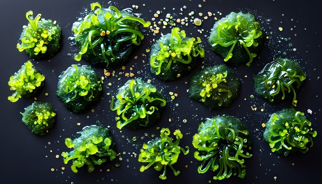 清新的海藻与贝壳在黑色背景上的组合,展现自然与海洋的元素。