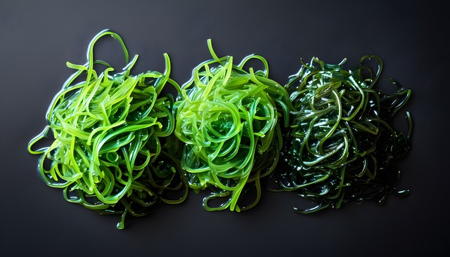 清新的海藻与贝壳在黑色背景上的组合,展现自然与海洋的元素。