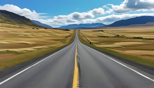 辽阔的公路穿过壮丽的山脉和平原,蓝天白云相映,展现自然的壮观之美。