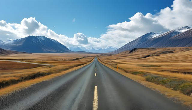 辽阔的公路穿过壮丽的山脉和平原,蓝天白云相映,展现自然的壮观之美。