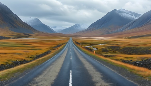 辽阔的公路穿过壮丽的山脉和平原,蓝天白云相映,展现自然的壮观之美。